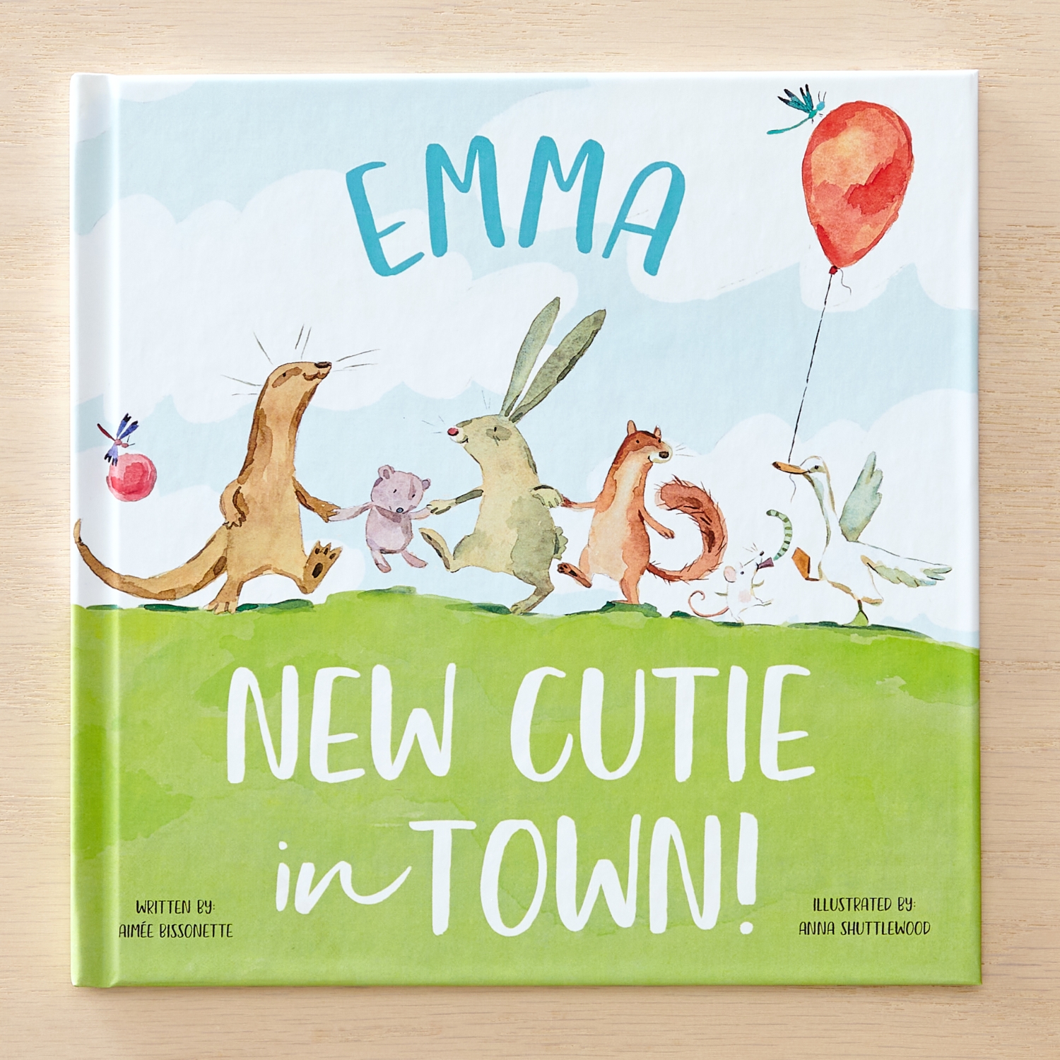 Children's book cover titled "Emma: New Cutie in Town." Features joyful animals and a balloon on a grassy hill under a bright sky. Cheerful and welcoming.